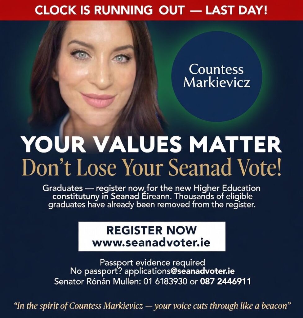 The university franchise has been expanded to include new institutions, beyond the traditional university cohort. Many more voters are eligible. You have the power to help Ireland change course. But you can’t do that unless you are on the registrar. If you are sick and tired of radical progressive politics and want to elect someone who reflects your concerns, you need to get on the registrar.