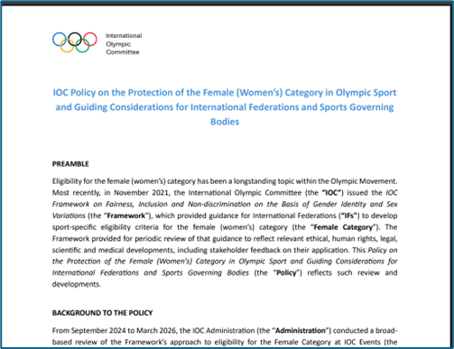 We signed letters by the International Consortium on Female Sport to Kirsty Coventry and the IOC imploring them to do the right thing and now that they have, we will keep campaigning for women and girls in Ireland and internationally to have fairness, safety and dignity in Sport. We will be writing to all National Governing Bodies in the coming weeks, urging them to immediately adopt a policy of a protected female category at all levels. We will be reassuring them that this is legal in Ireland, as evidenced by the IRFU policy and that it will be welcomed by the vast majority of those who are involved in sport.